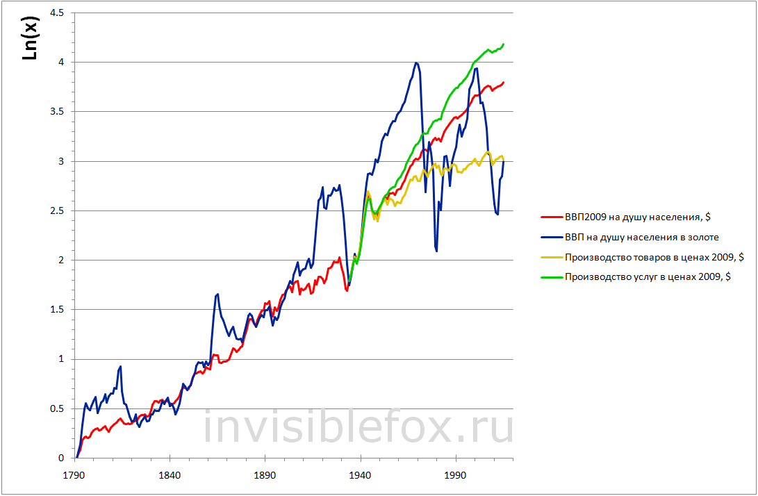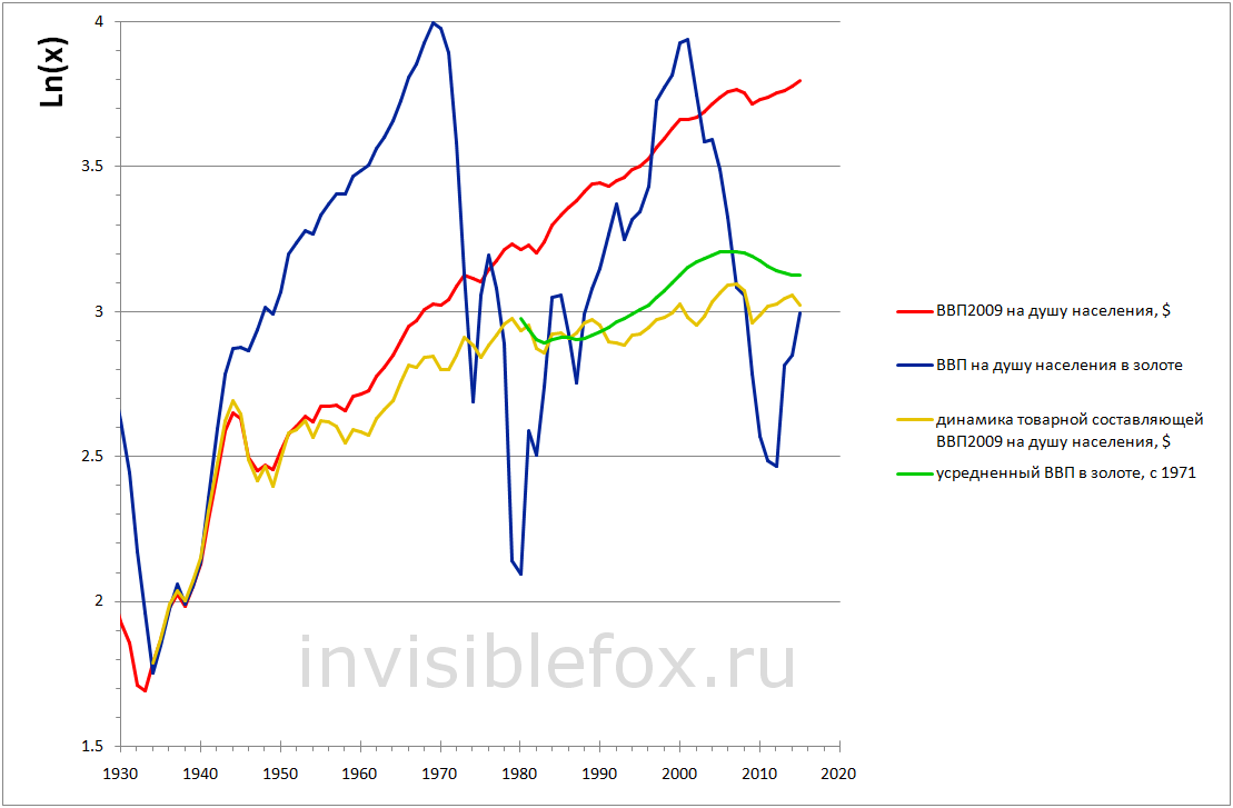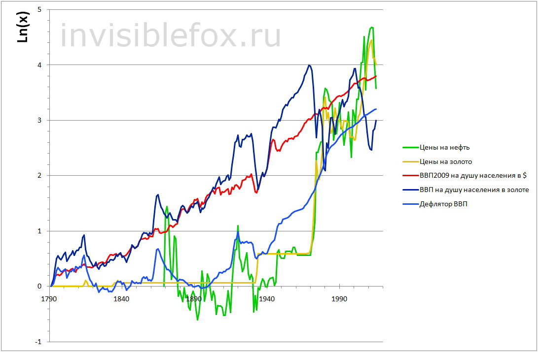 Статья начинается с самого неприятного для гуманитариев – определения понятий и единиц измерения, которые будут использованы в дальнейшем. Показателем, определяющим уровень экономического развития, а также рост экономики страны является валовой внутренний продукт (ВВП) на душу населения. Он представляет рыночную стоимость всех конечных товаров и услуг, предназначенных для непосредственного употребления, произведённых за год на территории конкретного государства, деленную на численность его населения. Однако уже здесь подстерегает первая ловушка и первый, связанный с ВВП США, миф. Произнеся слово "стоимость", следует не ошибиться в терминологии. Исходя из классического определения денег – "Деньги есть товар (!) по общему согласию служащий эталоном (мерой стоимости) для определения стоимости всех остальных товаров", следует признать, что современные ВАЛЮТЫ, включая доллар США, деньгами как мерой стоимости быть не могут. Никто не запрещает рассчитывать ВВП страны в долларах, но нужно понимать, что такая оценка требует коррекции на величину расхождения между долларом и истинными деньгами (или "просто деньгами"). А что ими является – в первую очередь, золото. Как заявил в 1912 г. на слушаниях в Конгрессе Дж.П.Морган "Кредит не является деньгами. Деньгами является золото, и ничто другое". Современные статистические данные прекрасно иллюстрируют его слова – графики ВВП США на душу населения, выраженного в долларах и в унциях золота, показывают совершенно противоположную динамику. Однако прежде следует до конца разобраться с вопросом о деньгах как мере стоимости. Помимо золота современными деньгами по факту является нефть. В силу того факта, что начиная с 1870 г. – года основания Стандарт Ойл и начала массовой нефтедобычи – и по сегодняшний день котировки нефти имеют практически 100% корреляцию с котировками золота. Вследствие чего нужно признать, что не существует двух независимых друг от друга рынков золота и нефти. То, что эти товары по происхождению не связаны друг с другом, не играет никакой роли. До тех пор, пока цена на нефть (см.график ниже) коррелирует с ценой на золото, ничьи слова веса иметь не будут. Экспериментальные данные должны опровергаться только другими экспериментальными данными. Поэтому по факту имеет место единый рынок некоего универсального товара, являющегося мерой стоимости всех остальных вещей. Теоретически к баррелю нефти и унции золота следовало бы добавить килограмм урана или киловатт-час электроэнергии, но свободного оборота урана или технической возможности хранить электроэнергию столь же легко как золото и нефть пока не существует. Вывод о взаимосвязи цен на золото и нефть подтверждается также тем, что какие бы попытки спекулятивно "оторвать" динамику цены на нефть от динамики цены на золото за последние 150 лет ни предпринимались, первая неуклонно "возвращается" ко второй. Парадоксально, но факт: до тех пор, пока золото имело жесткую привязку к доллару (или точнее доллар имел золотое содержание), долларовая цена на нефть также колебалась вокруг некоего фиксированного уровня, хотя нефть как товар ни с долларом, ни с золотом формально связана не была, и никто специальных усилий по стабилизации ее цены не предпринимал. В этом смысле демонстрируемый ниже график лучше всяких аналитиков позволяет спрог