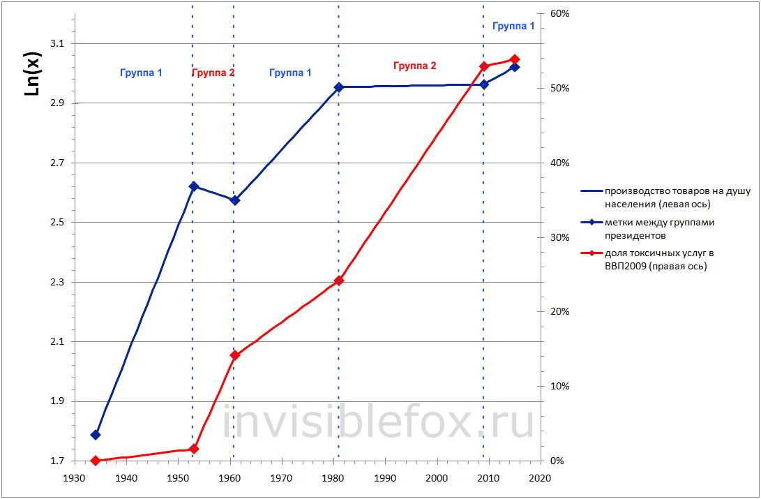 Итоги правления каждой группы: | 1 группа | 2 группа | Общий рост ВВП2009 на душу населения | в 4.6 раза | в 1.8 раза | Рост товаров на душу населения | в 3.6 раза | нет | Увеличение доли токсичных услуг в составе ВВП | 12.6% | 41.3% | Или среднегодовые показатели: | 1 группа | 2 группа | Общий рост ВВП2009 на душу населения | 3.3% | 1.60% | Рост товаров на душу населения | 2.8% | -0.1% | Прирост доли токсичных услуг в составе ВВП | 0.27% | 1.15% | Какие из этих таблиц можно сделать выводы: 1. В годы правления президентов 1 группы темпы роста материального производства были близки к темпам роста ВВП в целом. Тогда как в годы правления президентов 2 группы материальное производство не росло от слова совсем. Нельзя не признать, что рост материального производства не давал расти токсичным услугам. В те годы, когда товарное производство росло, доля токсичных услуг в составе ВВП увеличивалась крайне медленно. Зато в остальные годы доля токсичных услуг росла как на дрожжах. 2. В периода роста материального производства суммарный (официальный) ВВП показывал темпы роста примерно в 2 раза выше, чем в периоды, когда роста не было. 3. Примерно половину всего времени (36 лет из 82 за период с 1933 по 2015) рост ВВП США был фактически фиктивным, т.к. обеспечивался наращиванием исключительно токсичных услуг. 4. Реальное развитие Америки обеспечили забытые всеми "производственники" Рузвельт, Трумэн, Кеннеди, Джонсон, Никсон, Форд, Картер и Обама, которых добрым словом сейчас никто не вспоминает. В то время как их куда более "шумные" коллеги Эйзенхауэр, Рейган, Буш ст., Клинтон, Буш мл. по сути подвели Америку к неизбежному краху. Полученные графики неопровержимо свидетельствуют о том, что та же Рейганомика – это совсем не достижение, а главный позор Америки. И представление о США как о "современном постиндустриальном обществе всеобщего благоденствия" – ничуть не меньший миф. Та же сказка про голого короля на новый лад. Основой так разрекламированного постиндустриального благополучия является самый примитивный, хотя и прекрасно завуалированный экспорт ничем не обеспеченной национальной валюты. Пройдет совсем немного времени, и в учебниках по экономике современные события будут характеризоваться как пример массового заблуждения и самообмана. Уместно снова вспомнить марксизм с теорией о роли личности в истории. Следует признать, что при всем личностном разнообразии абсолютно все президенты США, начиная с Трумэна, занимались тем, что плыли по течению, не понимая смысла происходящих вокруг них событий. Почему громкая слава выпала именно Эйзенхауэру, Рейгану и Бушу ст. – потому что во время правления Эйзенхауэра Америка активно наполняла долларами Европу, получив огромный рынок для выгодных инвестиций. Во времена Рейгана точно так же насыщался долларами Китай (через перенос производства и юань, жестко привязанный к доллару). Во времена Буша ст. Китай продолжил насыщаться, плюс открылись страны бывшего соцлагеря, включая Россию. Смешно, но как бы выигрышно ни выглядел на фоне Брежнева Рейган, на самом деле он внутренне ничем от Брежнева не отличался. И тот и другой ради возможности побыть президентом и спокойно умереть в собственной постели обеспечили неизбежный развал своей страны. Абсолютно не отдавая себе отчет, какими процессами они в действительности руководят. И тот и другой по воле случая получили 