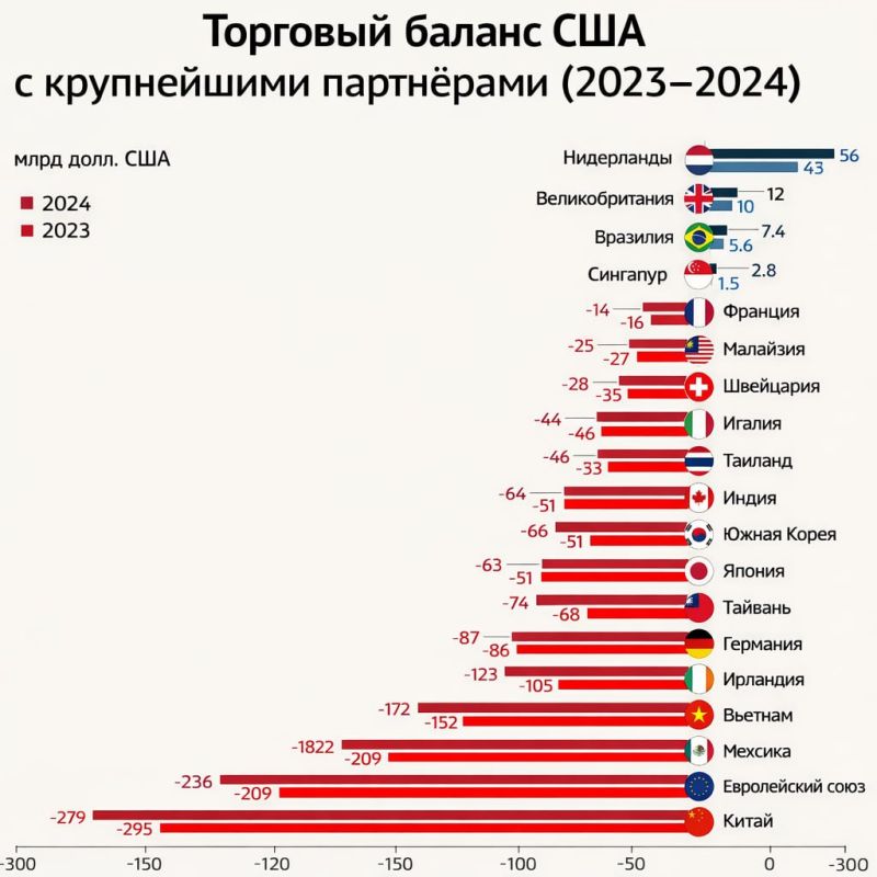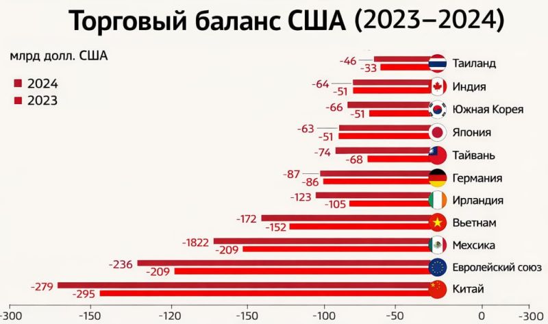 С первого же дня своего пребывания в Белом доме 47-й президент США Дональд Трамп принялся восстанавливать «справедливость» в торговых отношениях Америки с остальным миром. А «несправедливость» выражалась в том, что Америка имела колоссальный дефицит торгового баланса. Т. е. покупала на мировом рынке намного больше, чем экспортировала. Торговые дефициты стали хроническим состоянием Америки с середины 1970-х годов. Но полвека назад они измерялись миллиардами долларов, а в ХХI веке уже сотнями миллиардов долларов. В последние годы величина дефицита торгового баланса США имела следующие значения (млрд долл.): 2021 г. – 845; 2022 г. – 948; 2023 г. – 774; 2024 г. – 918. Вот как распределялся дефицит торгового баланса США в 2024 году по странам, являющимся главными торговыми партнерами Америки (млрд долл.): - – Китай – 295,4
